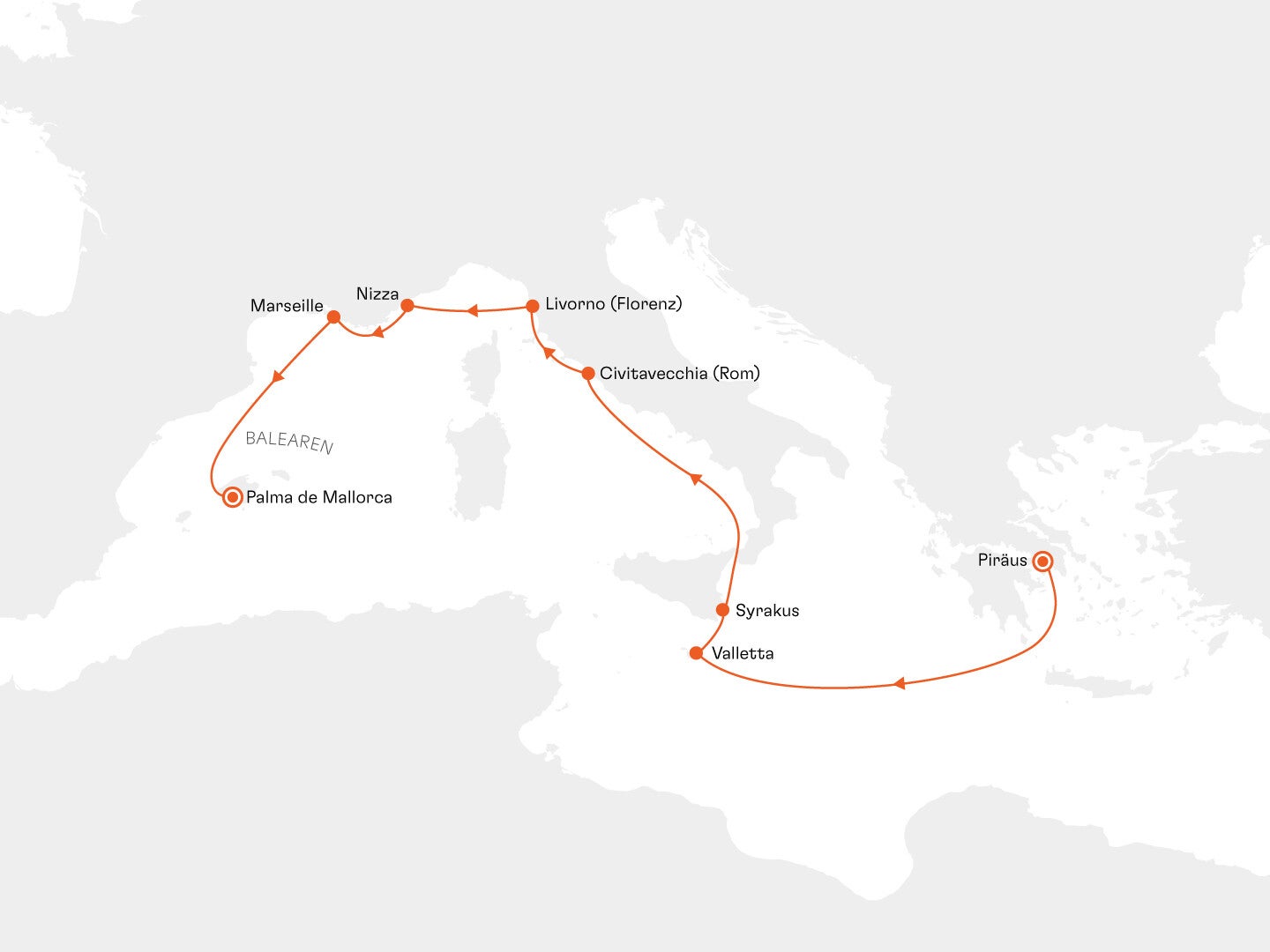 Route: Palma, Mallorca / Spanien - Ajaccio, Korsika / Frankreich - Alghero, Sardinien / Italien -