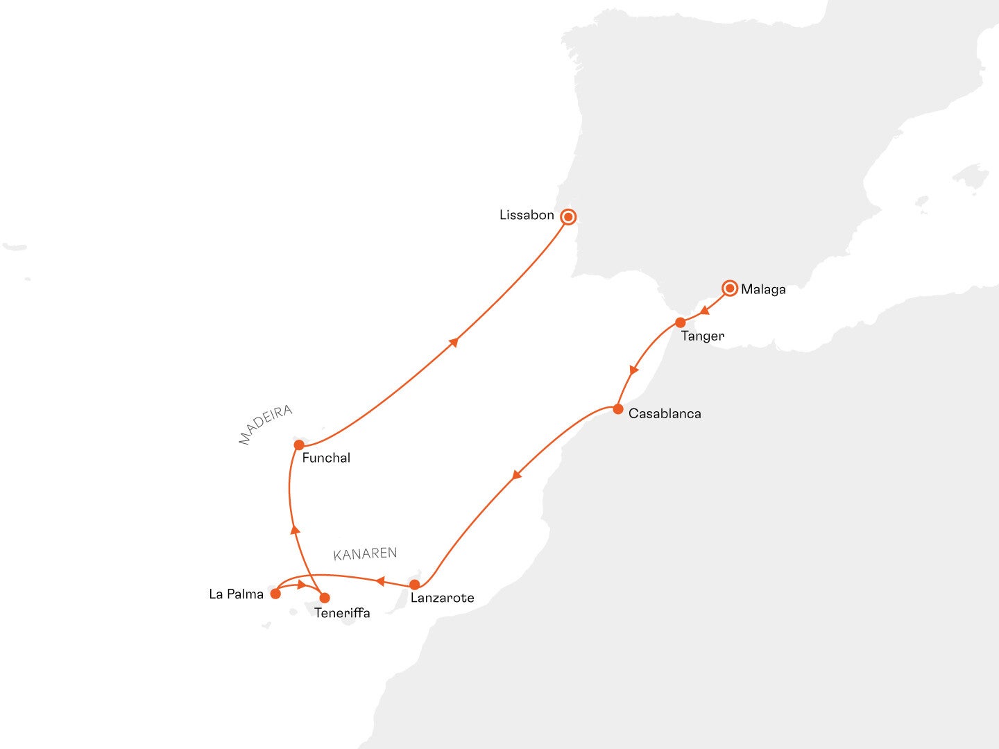 Route: Málaga, Andalusien / Spanien - Tanger (Tanjah) / Marokko - Casablanca / Marokko -