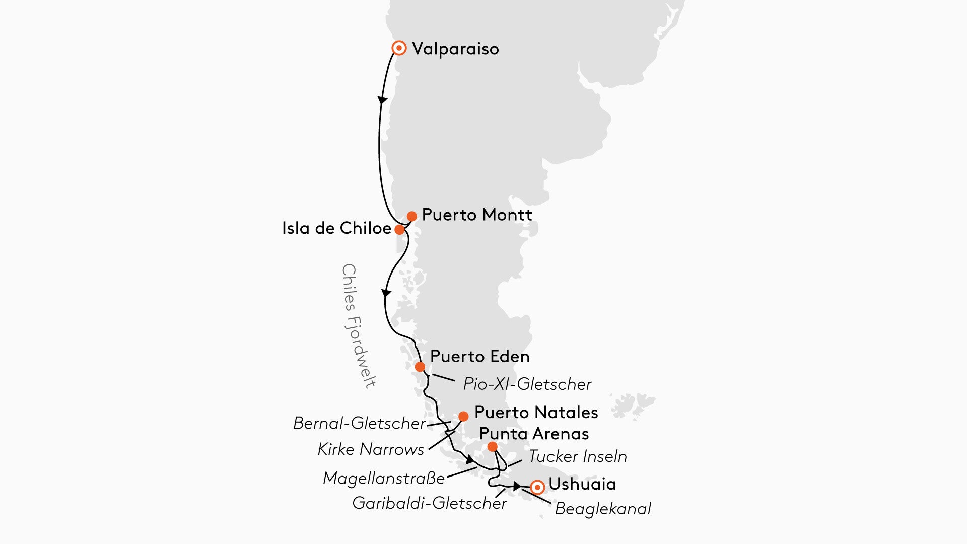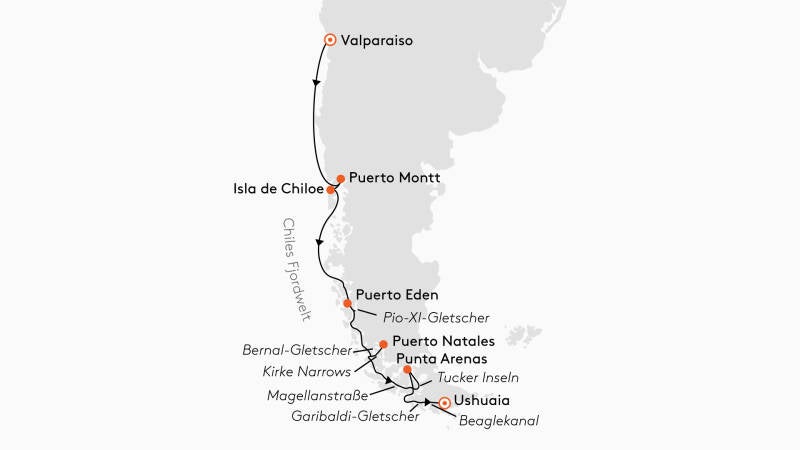 Route: Valparaiso, Chile – Puerto Montt, Chile – Fahrt durch die chilenischen Fjorde – Punta Arenas, Chile – Garibaldi Gletscher, Chile – Ushuaia, Argentinien – Flug nach Buenos Aires