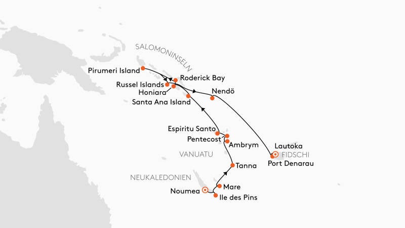 Route: Noumea, Neukaledonien – Ile des Pins, Neukaledonien – Mare, Neukaledonien – Vanuatu/ u.a. Tanna, Ambrym, Pentecost, Espiritu Santo –