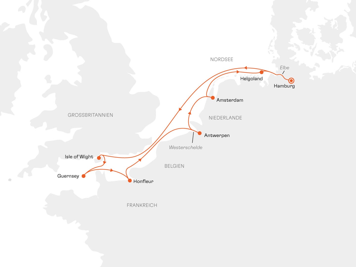 Route: Hamburg - Isle of Wight / Großbritannien - Guernsey, Kanalinseln / Großbritannien - Honfleur / Frankreich - Antwerpen / Belgien - Amsterdam / Niederlande - Helgoland – Hamburg